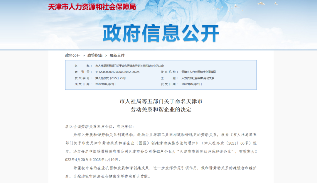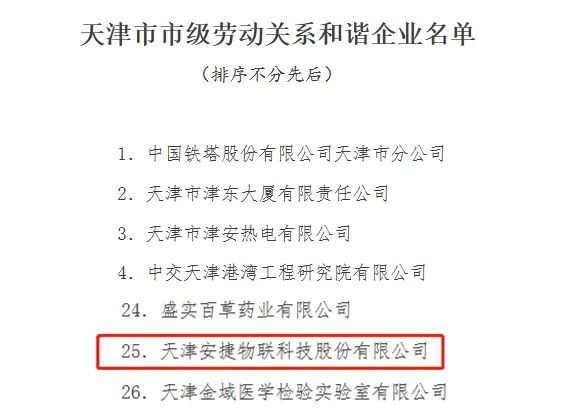 2022年4月26日,天津市人力资源和社会保障局发布了《市人社局等五部门关于命名天津市劳动关系和谐企业的决定》,命名天津z6com·尊龙(中国)时凯集团物联科技股份有限公司等43户企业为“天津市市级劳动关系和谐企业”,有效期为2022年4月20日至2025年4月19日。