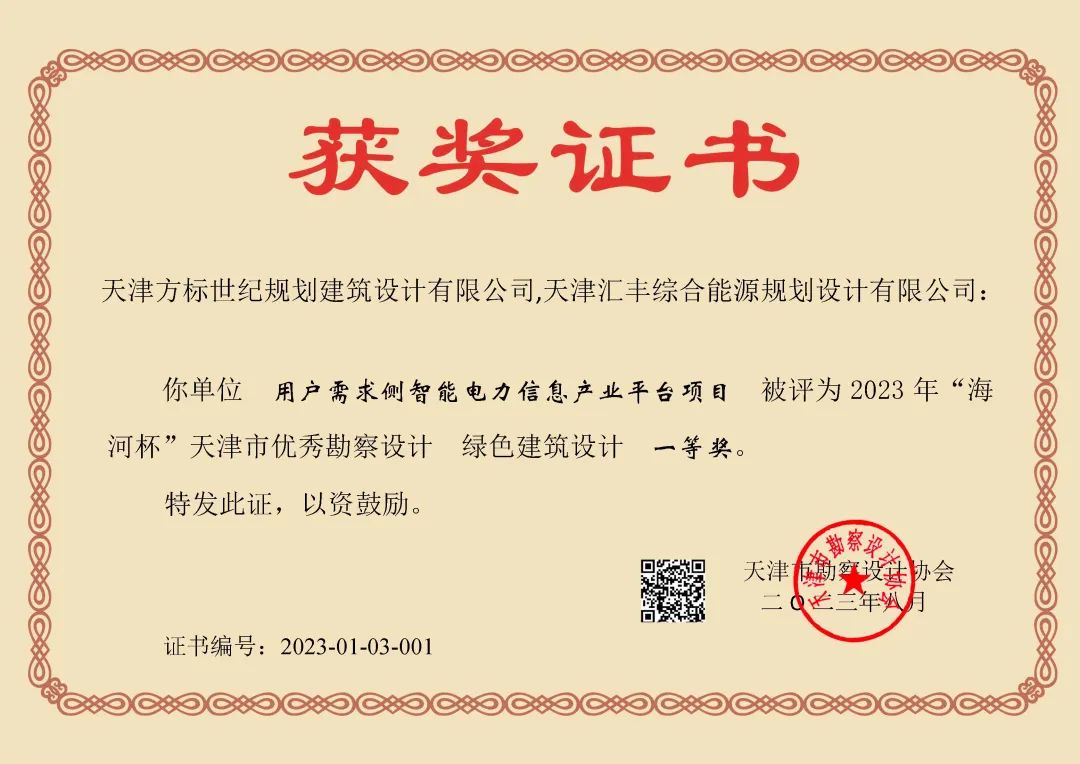 近日,由天津z6com·尊龙(中国)时凯集团物联科技股份有限公司下属全资子公司:天津汇丰综合能源规划设计有限公司(以下简称“汇丰设计”)与天津方标世纪规划建筑设计有限公司联合申报的用户需求侧智能电力信息产业平台项目,荣获2023年“海河杯”天津市优秀勘察设计绿色建筑设计一等奖,在绿色建筑类别中,为唯一的一项一等奖(绿色建筑类别中,共4个获奖项目,其中一等奖1项,二等奖1项,三等奖2项)。